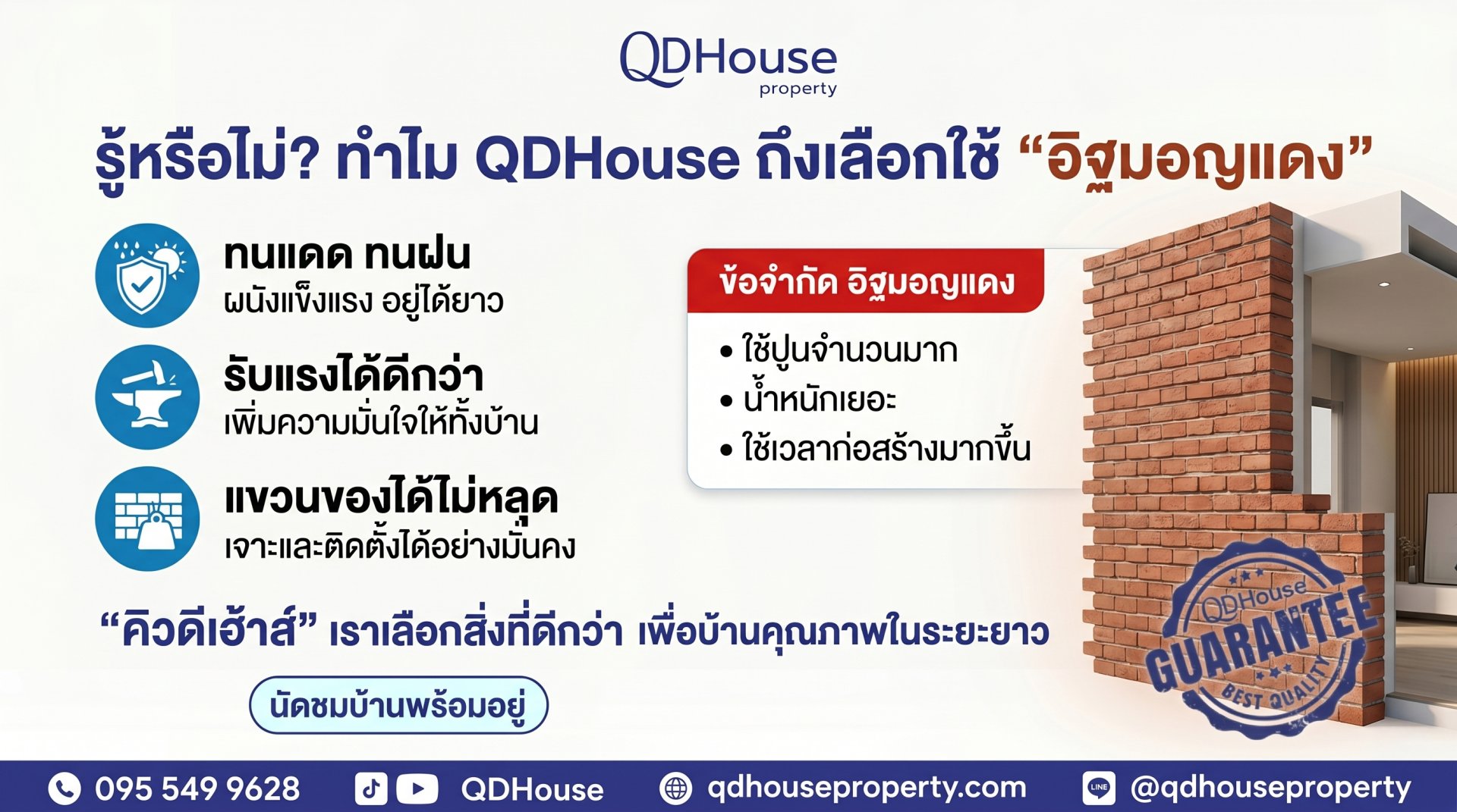 ในการตัดสินใจซื้อบ้านสักหลัง "วัสดุก่อสร้าง" คือหัวใจสำคัญที่บ่งบอกถึงความแข็งแรงทนทานและอายุการใช้งานของตัวบ้าน หลายคนอาจสงสัยว่า ในยุคที่มีวัสดุทางเลือกมากมาย ทำไมโครงการบ้านของ QDHouse (คิวดีเฮ้าส์) ถึงยังคงยืนหยัดและเจาะจงเลือกใช้ "อิฐมอญแดง" เป็นวัสดุหลักในการก่อสร้างผนังบ้าน?